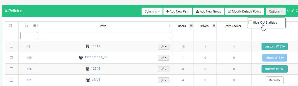 Regrouped policies into clearer categories: Devices, Keypad Devices, PortBlocker, and Other (for legacy products).