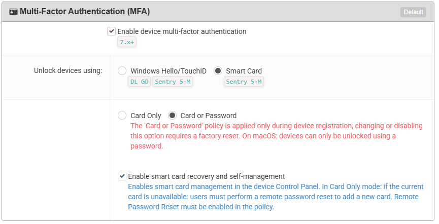 - Under Multi-Factor Authentication (MFA), enable by checking the Smart Card option.