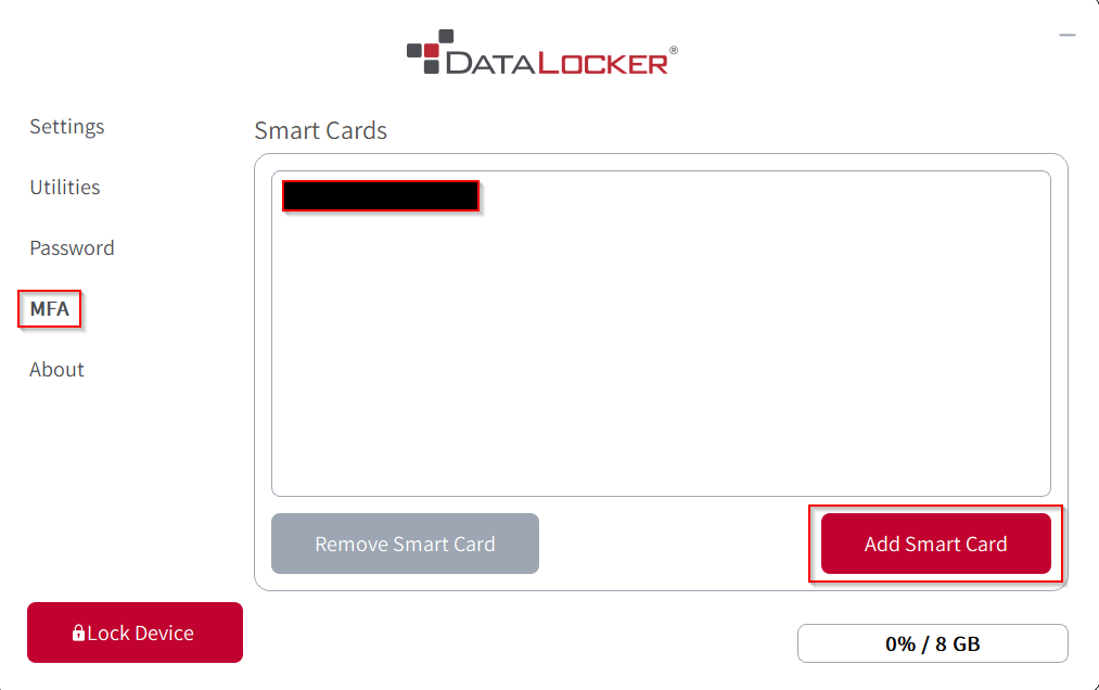 - In the Unlocker Control Panel select MFA and then press Add Smart Card. This will prompt you for your device password if you are using the Card or Password option in your policy selection.